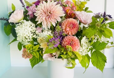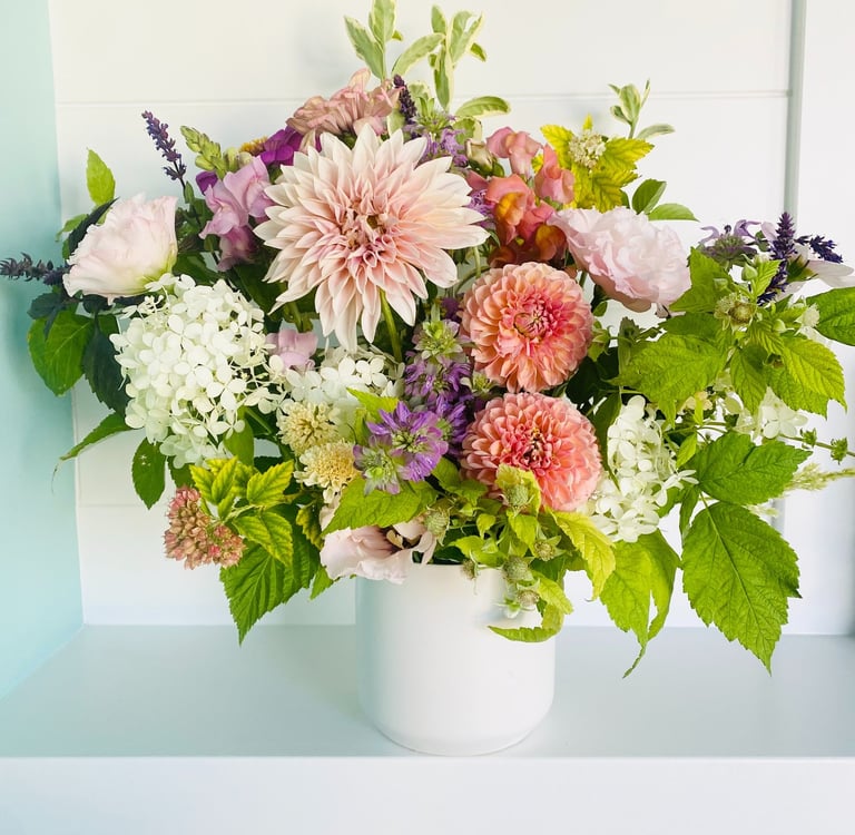 The new yard was thriving and everything was growing and blooming. At this time, I was a stay at home mom. One random day I needed a break from the craziness of kids and needed the peace of outdoors. We went outside and I decided to cut some of our blooming hydrangeas. I then noticed what else was blooming and all of a sudden I had spent an hour in a “If You Give a Mouse a Cookie” type situation, moving from plant to plant collecting a gorgeous bouquet. The next day I went out and cut more flowers but this time I decided I would take them to neighbors. Working with flowers and brightening other's lives with them…that was happiness! I was hooked!